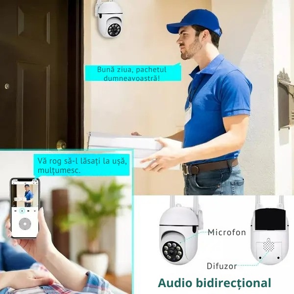 Microfonul încastrat în camera de supraveghere exterioară vă permite să ascultați și să vorbiți prin intermediul aplicației noastre. Sistemul de comunicație cu două canale audio vă permite să vorbiți cu cei dragi sau cu prietenii, în timp ce senzorul de detectare a mișcării emite o alarmă care va îndepărta vizitatorii nedoriți sau animalele.