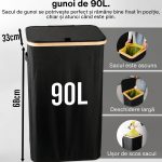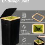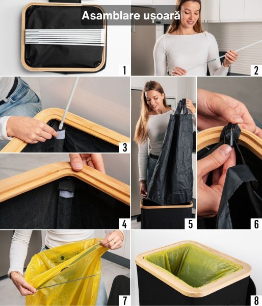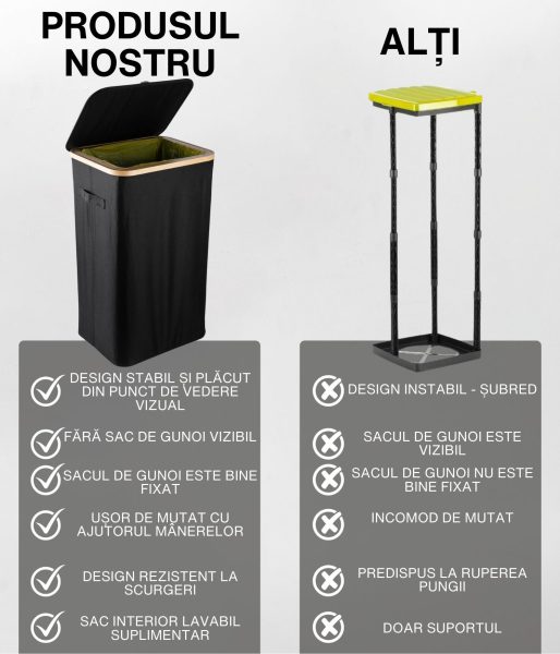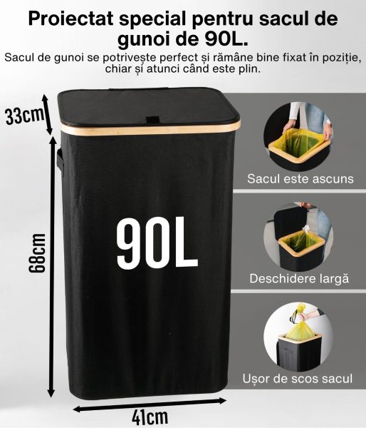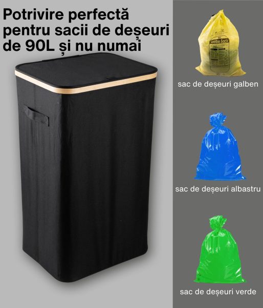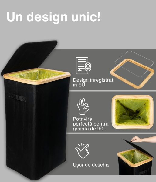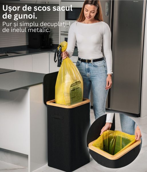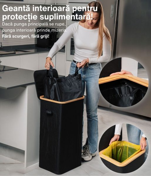 Acest model se mândrește cu cusături întărite, materiale durabile și o culoare neagră sofisticată din punct de vedere estetic, care se integrează perfect în orice spațiu – fie că este vorba despre un birou modern sau o bucătărie minimalistă. Designul său compact, dar spațios, permite reciclarea eficientă fără a ocupa prea mult spațiu. În plus, coșul de gunoi are un cadru din bambus cu un inel din fier de care este atașat sacul de gunoi, ceea ce îl face ușor de schimbat și de utilizat. Coșul de gunoi este proiectat pentru saci de gunoi de 90 l, dar puteți utiliza cu ușurință saci mai mari.