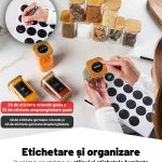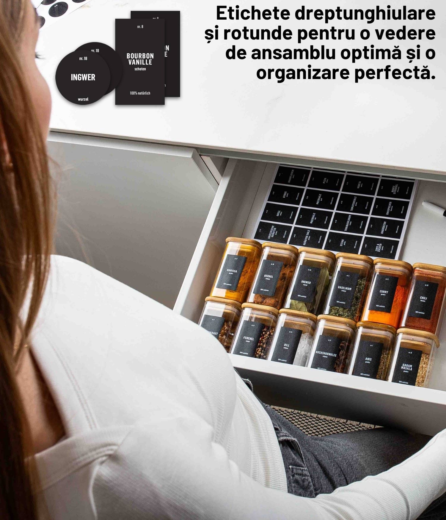 În plus față de borcanele de sticlă, veți primi și 96 de etichete în limba germană și 46 etichete goale pentru a vă eticheta recipientele de depozitare, ușile dulapurilor sau rafturile de condimente, folosind creionul de cretă care este, de asemenea, inclus. Etichetele pot fi șterse și rescrise în orice moment.