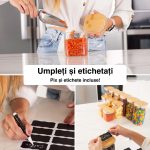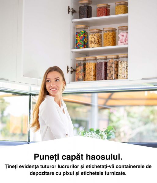 În plus față de borcanele de sticlă, veți primi și 8 etichete adezive practice pe care le puteți folosi pentru a vă eticheta recipientele de depozitare, ușile dulapurilor sau rafturile de condimente, folosind creionul de cretă care este, de asemenea, inclus. Etichetele pot fi șterse și rescrise în orice moment.