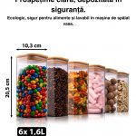 Veți primi un total de 6 borcane de depozitare cu o lățime de 10 cm. Înălțimile variază după cum urmează: 6 x 20 cm – 1600ml.