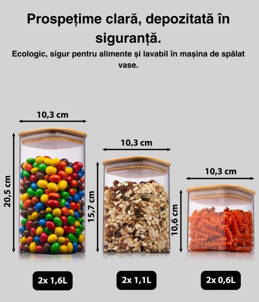 Veți primi un total de 6 borcane de depozitare cu o lățime de 10 cm. Înălțimile variază după cum urmează: 2x 20cm – 1600 ml, 2x 16 cm – 1100 ml, 2x 11cm – 650ml.