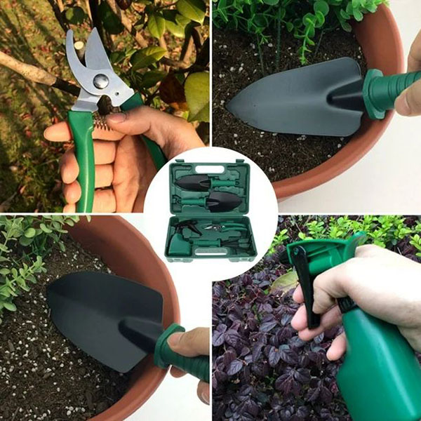1 x Set de unelte pentru grădinărit cu cutie de depozitare: 1 x greblă, 2 x lopeți pentru plantare:, 1 x foarfecă, 1 x sticlă cu pulverizator