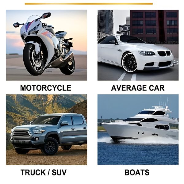 Utilizați CARCOAT pe mașini, bărci, motociclete, rulote, ATV-uri și multe altele. Este sigur pentru toate suprafețele, inclusiv vopsea, plastic și sticlă.