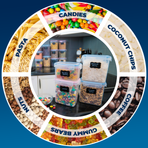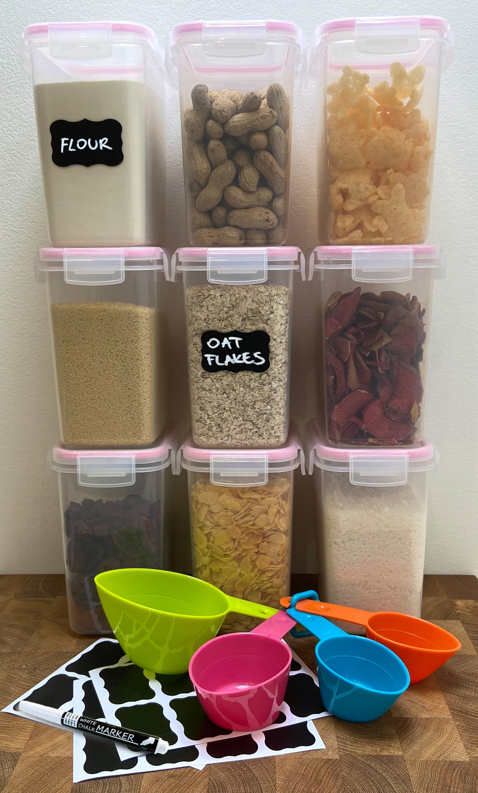 Naš komplet je idealen za shranjevanje prigrizkov, kot so sladkarije, granola, oreščki in piškoti, osnovnih živil, kot je moka, in živil za zajtrk, kot je kava. Shranjevanje v teh prozornih posodah je enostavno, živila pa bodo dobro organizirana in vedno pri roki. Nikoli več se vam ne bo zgodilo, da bi pozabili, kam ste nekaj shranili!