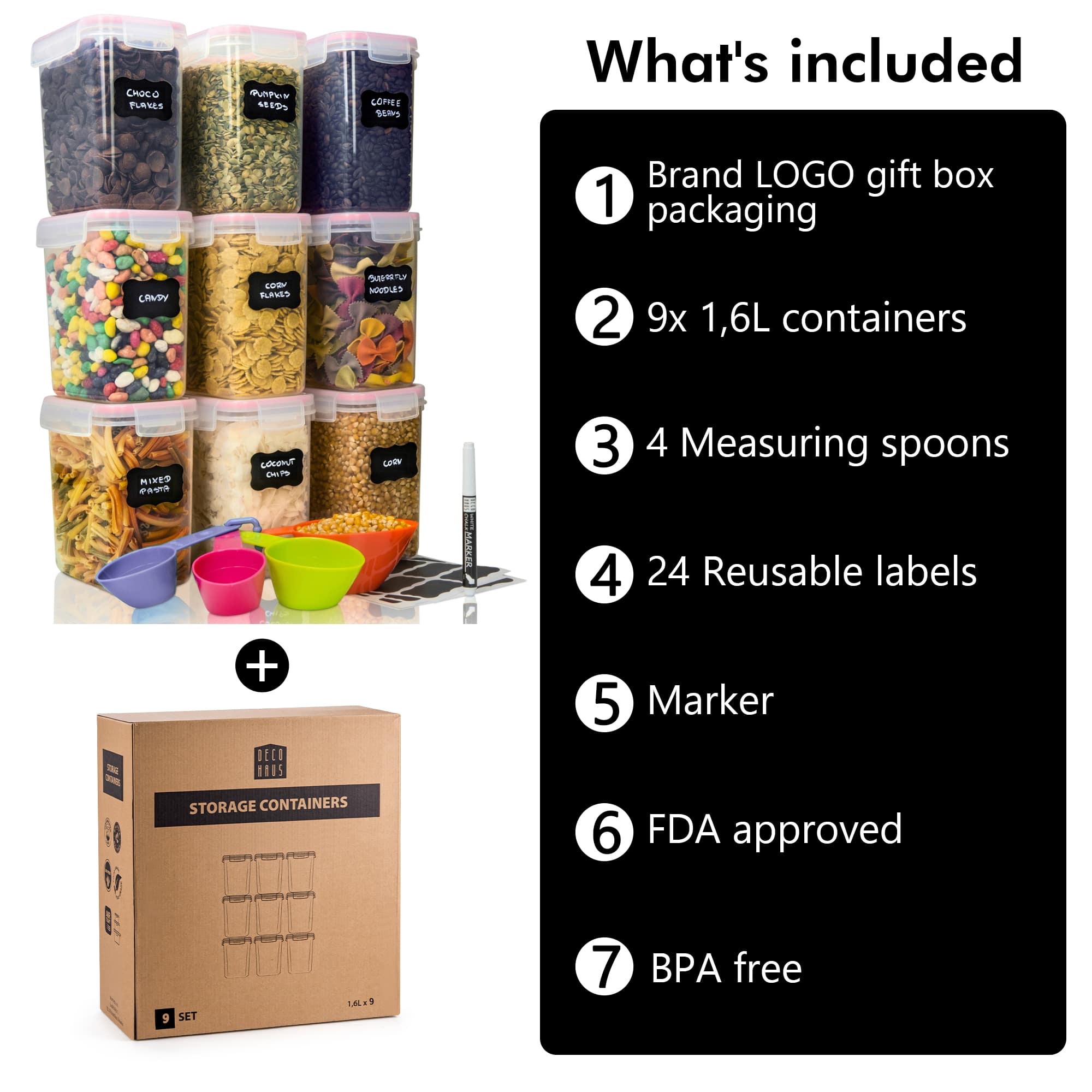 La achiziția dumneavoastră includem câteva elemente suplimentare pentru a adăuga valoare și pentru a vă îmbunătăți și mai mult organizarea. Fiecare set vine cu etichete reutilizabile și un marker de înaltă calitate pentru o etichetare facilă. Veți primi, de asemenea, mai multe căni de măsurare pentru a vă ajuta în aventurile dumneavoastră culinare.