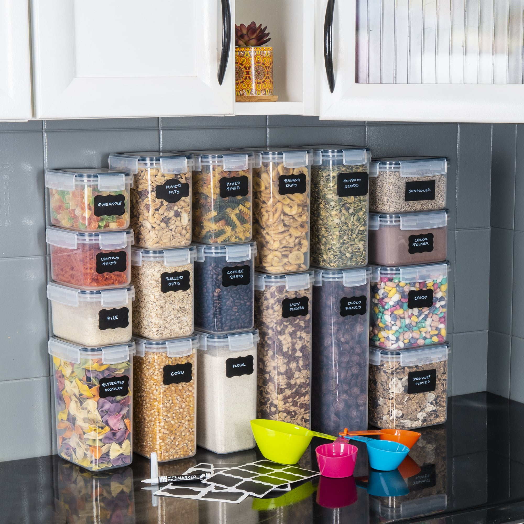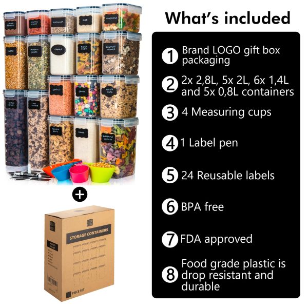 La achiziția dumneavoastră includem câteva elemente suplimentare pentru a adăuga valoare și pentru a vă îmbunătăți și mai mult organizarea. Fiecare set vine cu etichete reutilizabile și un marker de înaltă calitate pentru o etichetare facilă. Veți primi, de asemenea, mai multe căni de măsurare pentru a vă ajuta în aventurile dumneavoastră culinare.