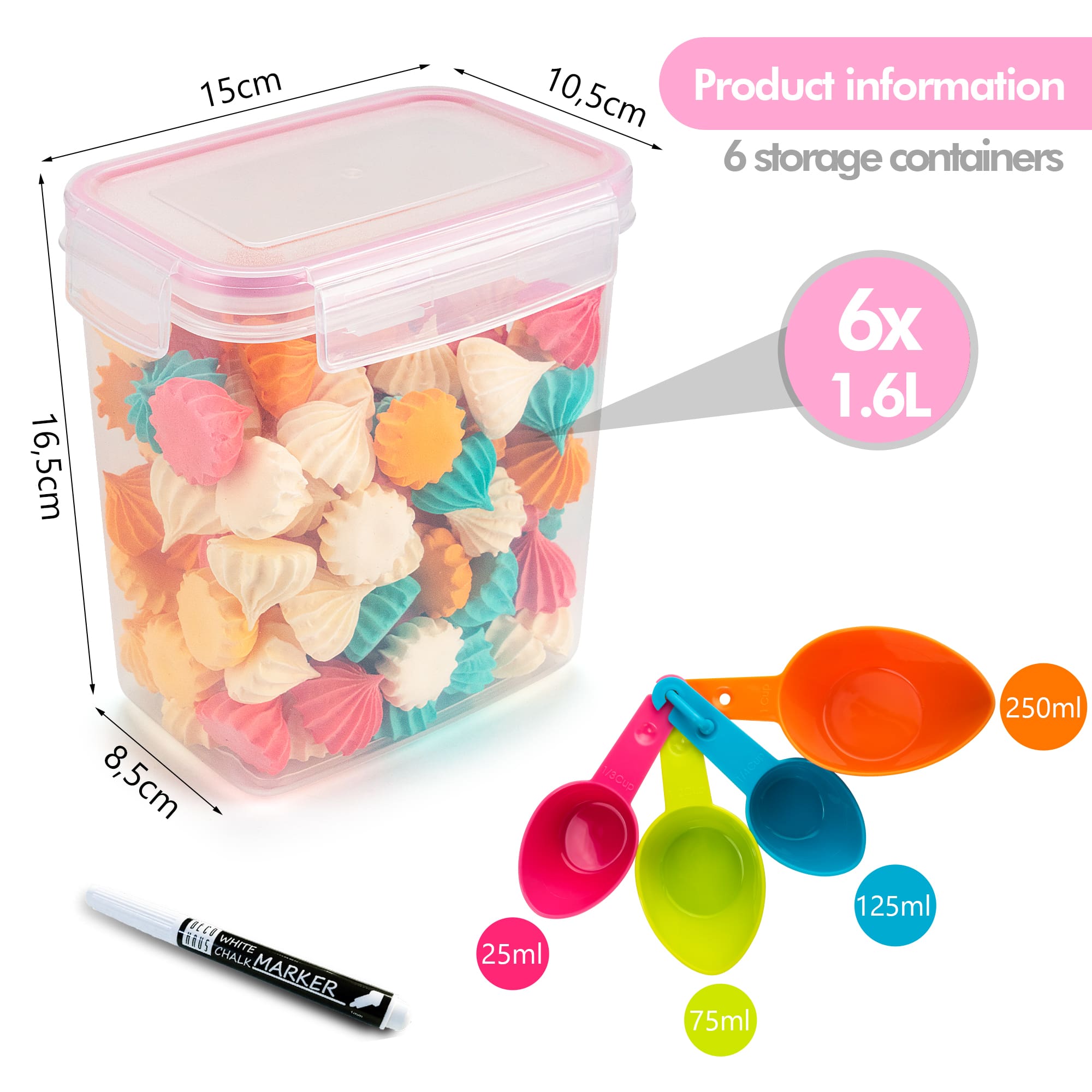 La achiziția dumneavoastră includem câteva elemente suplimentare pentru a adăuga valoare și pentru a vă îmbunătăți și mai mult organizarea. Fiecare set vine cu etichete reutilizabile și un marker de înaltă calitate pentru o etichetare facilă. Veți primi, de asemenea, mai multe căni de măsurare pentru a vă ajuta în aventurile dumneavoastră culinare.