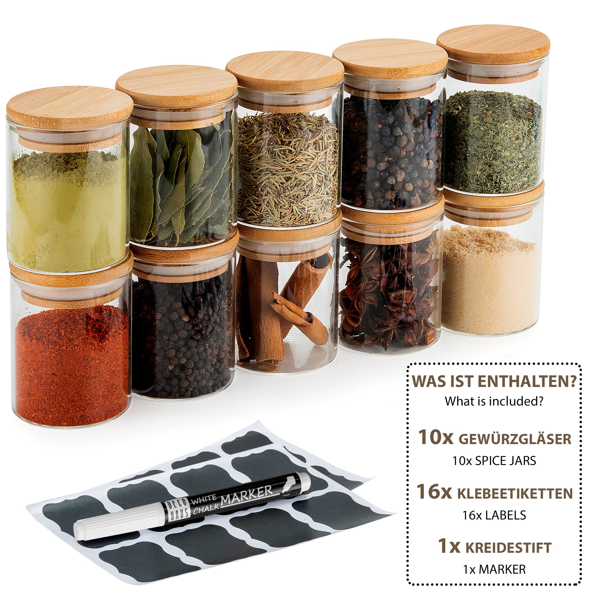 Deco Haus Set de 10 borcane cu capac – etanșe, lavabile în mașină, utilizabile în cuptorul cu microunde – Pentru prăjituri, paste, cereale, cafea – 8,5 cm înălțime, 6,5 cm diametru