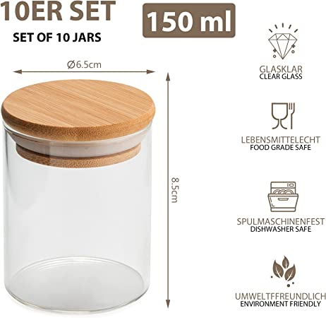 Setul nostru conține un total de 10 borcane de depozitare. Toate au un diametru de 6,5 cm și o înălțime de 8,5 cm, cu o capacitate de 150 ml. Acest lucru facilitează depozitarea și, în același timp, asigură o prezentare elegantă și uniformă.