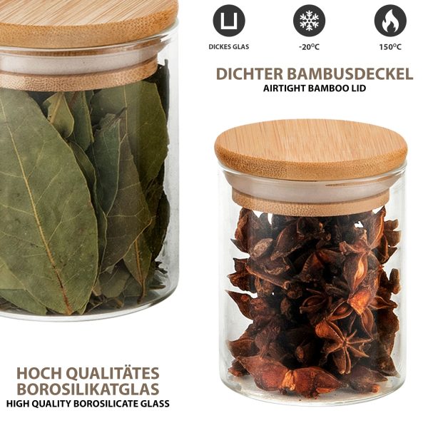 Borcanele de sticlă sunt fabricate exclusiv din sticlă borosilicată de înaltă calitate, robustă, rezistentă la temperatură și sigură pentru alimente. Capacele sunt confecționate din bambus robust și închid borcanele ermetic mulțumită garniturii din silicon.