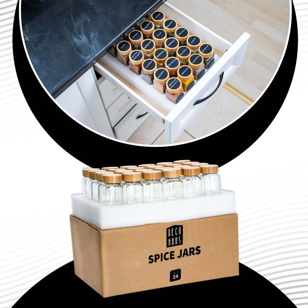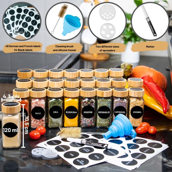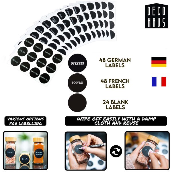 ✔ MARCĂ-ȚI CONDIMENTELE CA UN PROFESIONIST! – Setul de borcane de condimente cu capac include și 48 de etichete în limba franceză pe care sunt imprimate numele celor mai comune condimente și 24 de etichete goale pe care poți scrie cu creionul cu cretă inclus.