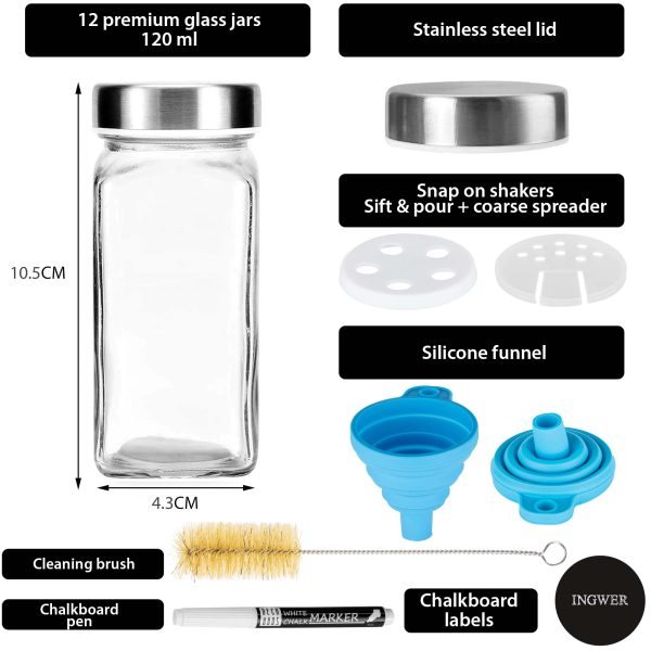 Set de 12 borcane de condimente Deco Haus cu capace din oțel inoxidabil – etichete, pâlnie, perie, marker – se potrivește cu rafturi de condimente cu 4 rafturi – borcane de depozitare și distribuire 120 ml, 10,5 x 4,3 cm