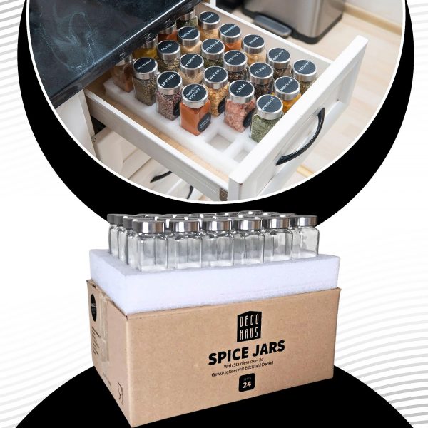 ✔ MARCĂ-ȚI CONDIMENTELE CA UN PROFESIONIST! – Setul de borcane de condimente cu capac include și 48 de etichete în limba franceză pe care sunt imprimate numele celor mai comune condimente și 24 de etichete goale pe care poți scrie cu creionul cu cretă inclus.