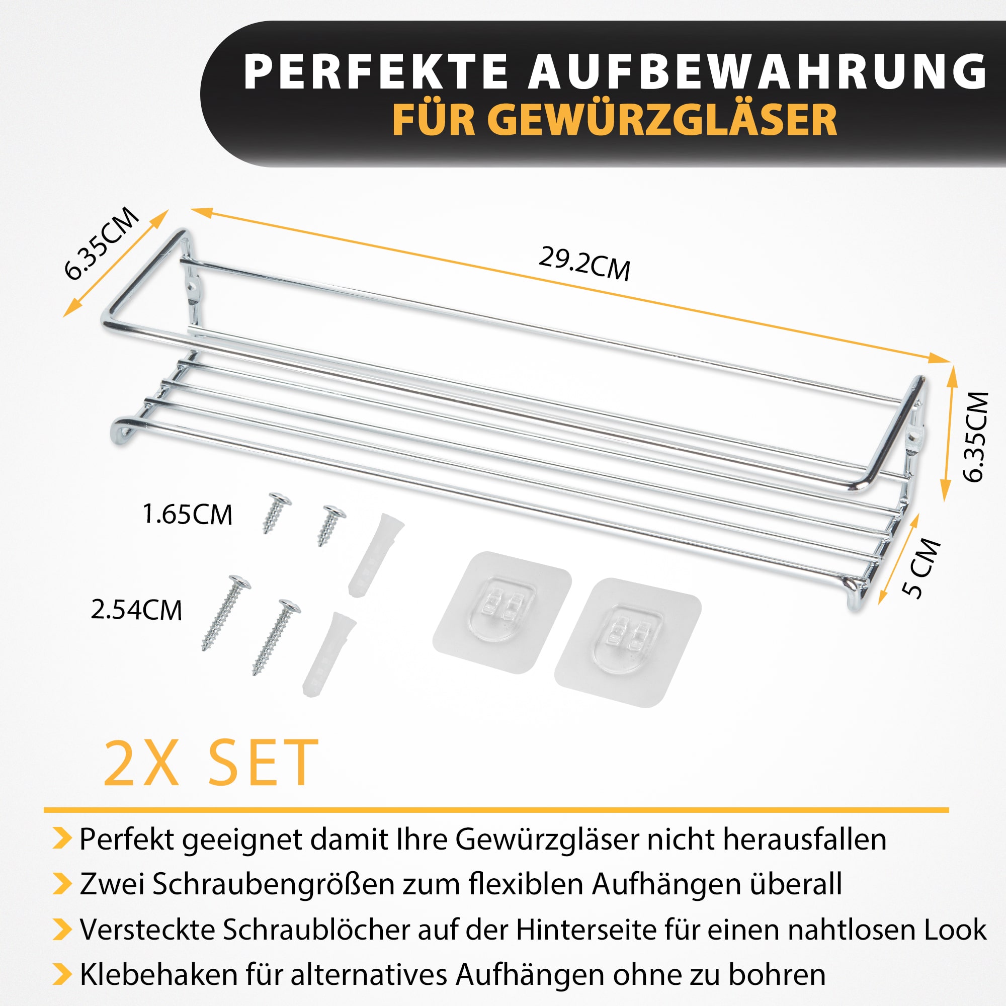 Deco Haus Set de 2 rafturi de metal pentru condimente – Rafturi de bucătărie, accesoriu pentru dulap, organizator de condimente – compatibil cu borcanele noastre de condimente – Rafturi de depozitare care pot fi montate cu adeziv sau cu șuruburi – argintiu, 29×6.35x5cm