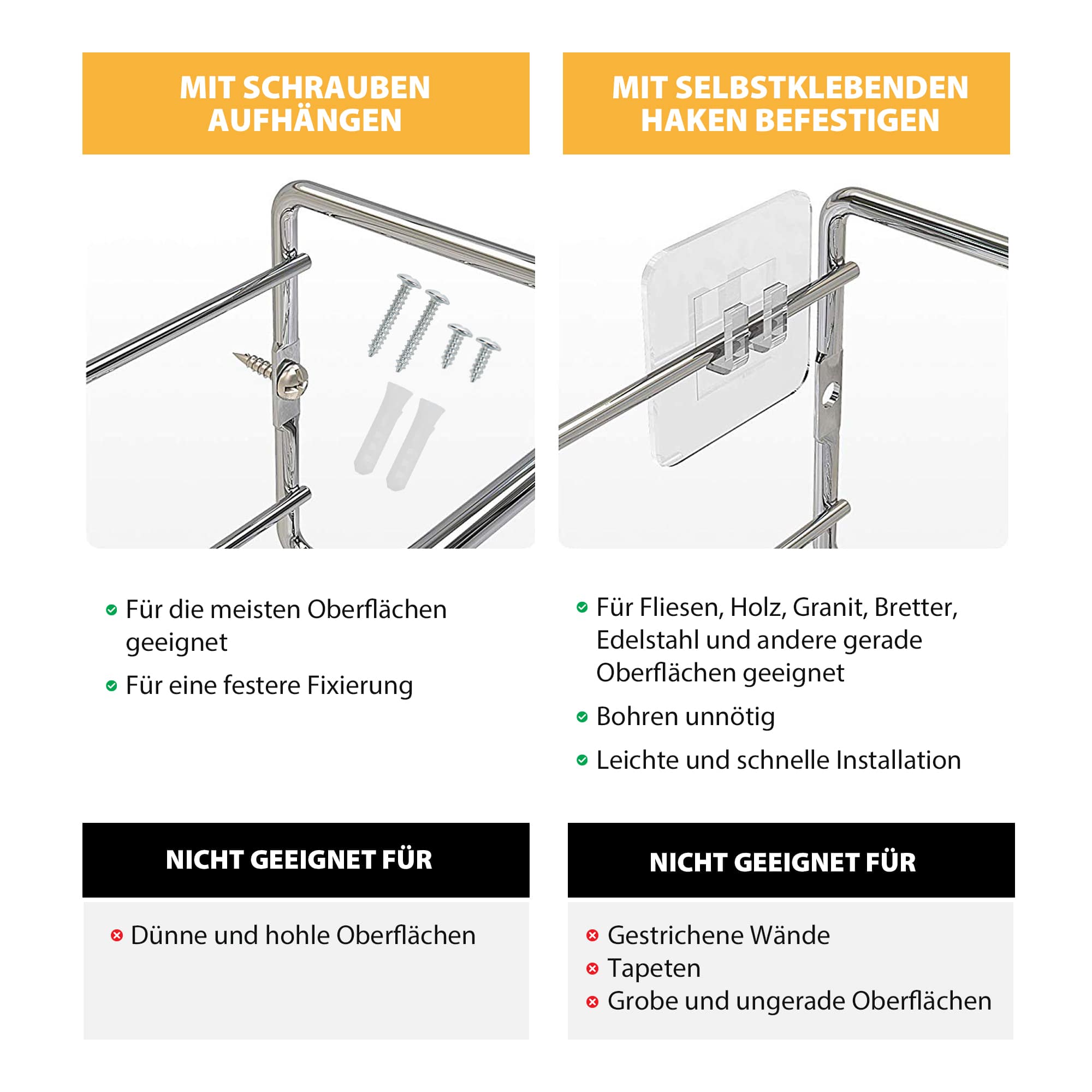 ✅ ASAMBLARE UȘOARĂ – Pentru a instala aceste rafturi metalice pentru condimente, puteți utiliza diblurile și șuruburile furnizate sau pur și simplu montați rafturile folosind plăcuțele adezive incluse. Alegerea vă aparține!