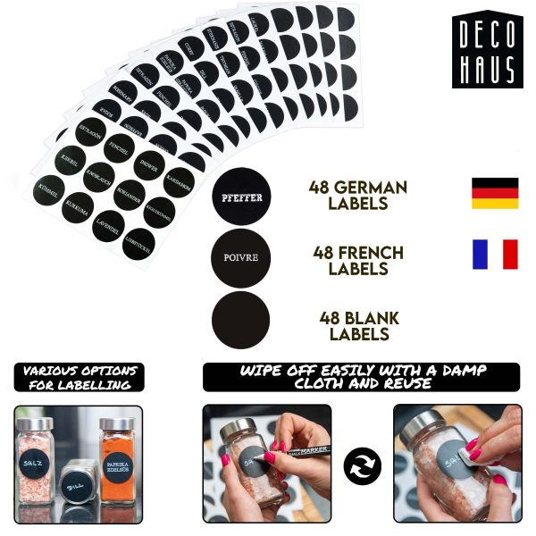 ✔ MARCĂ-ȚI CONDIMENTELE CA UN PROFESIONIST! – Setul de borcane de condimente cu capac include și 48 de etichete în franceză și germană pe care sunt imprimate numele celor mai comune condimente și 48 de etichete goale pe care poți scrie cu creionul cu cretă inclus.