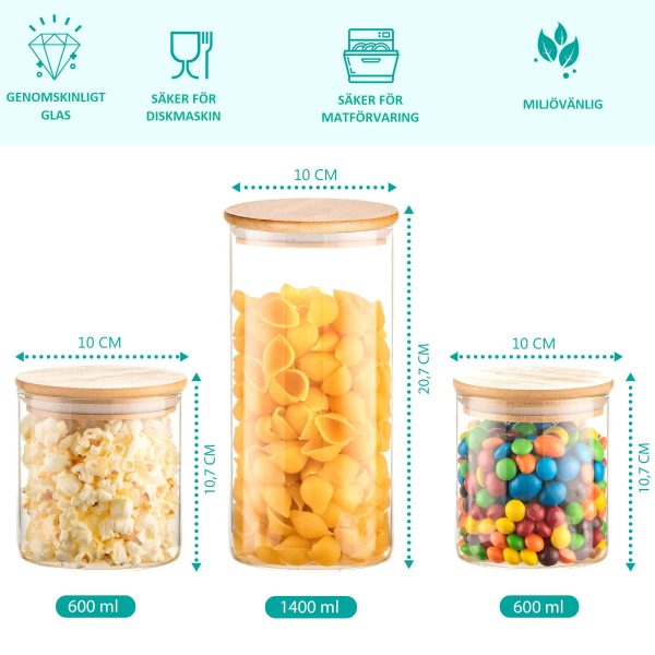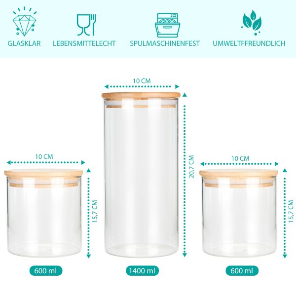 Veți primi un total de 3 borcane de depozitare cu un diametru de 10 cm. Înălțimile variază după cum urmează: 20 cm – 1400 ml, in 2x 10 cm – 600 ml.