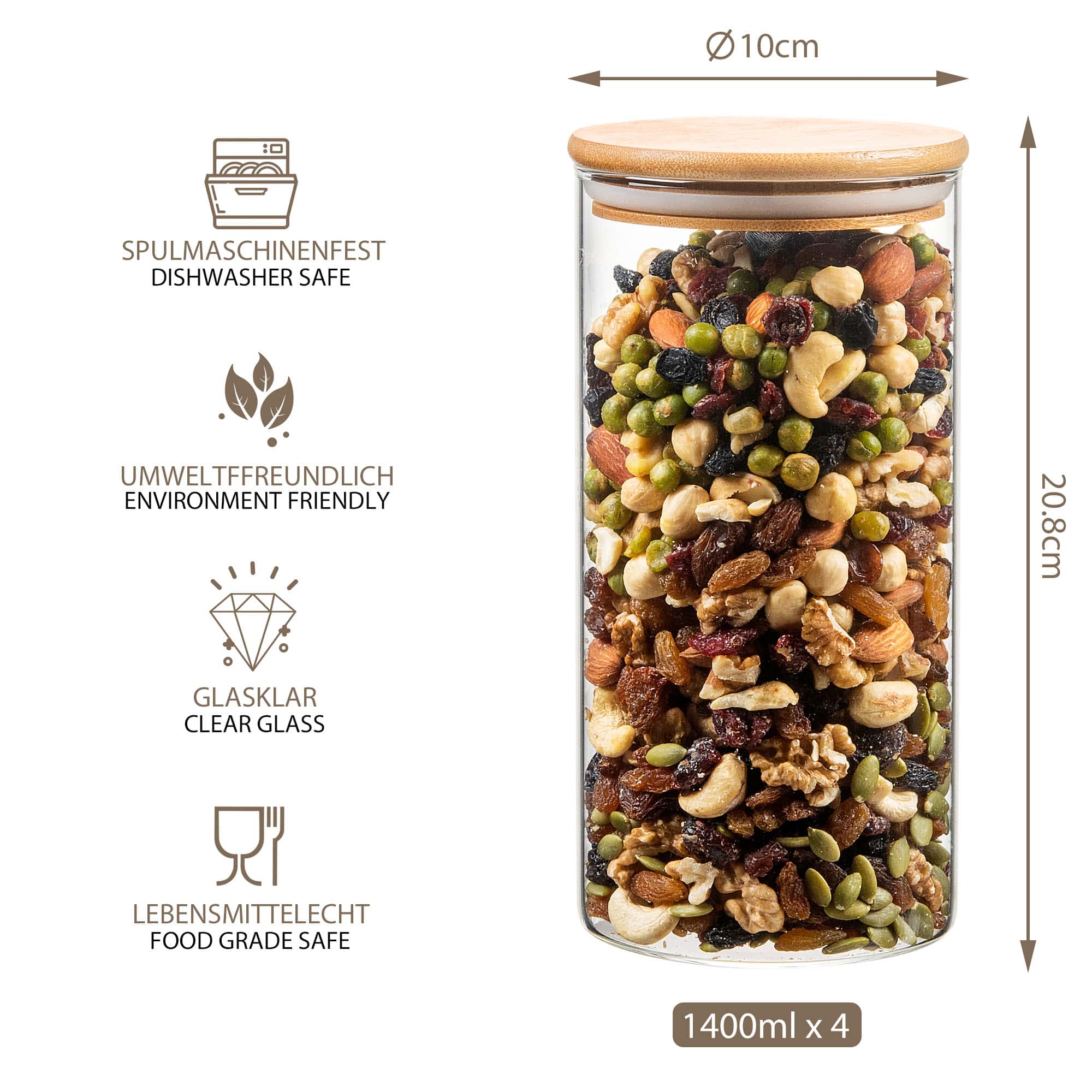 Veți primi un total de 4 borcane de depozitare cu un diametru de 10 cm. Înălțimile variază după cum urmează: 4 x 20 cm – 1400ml.