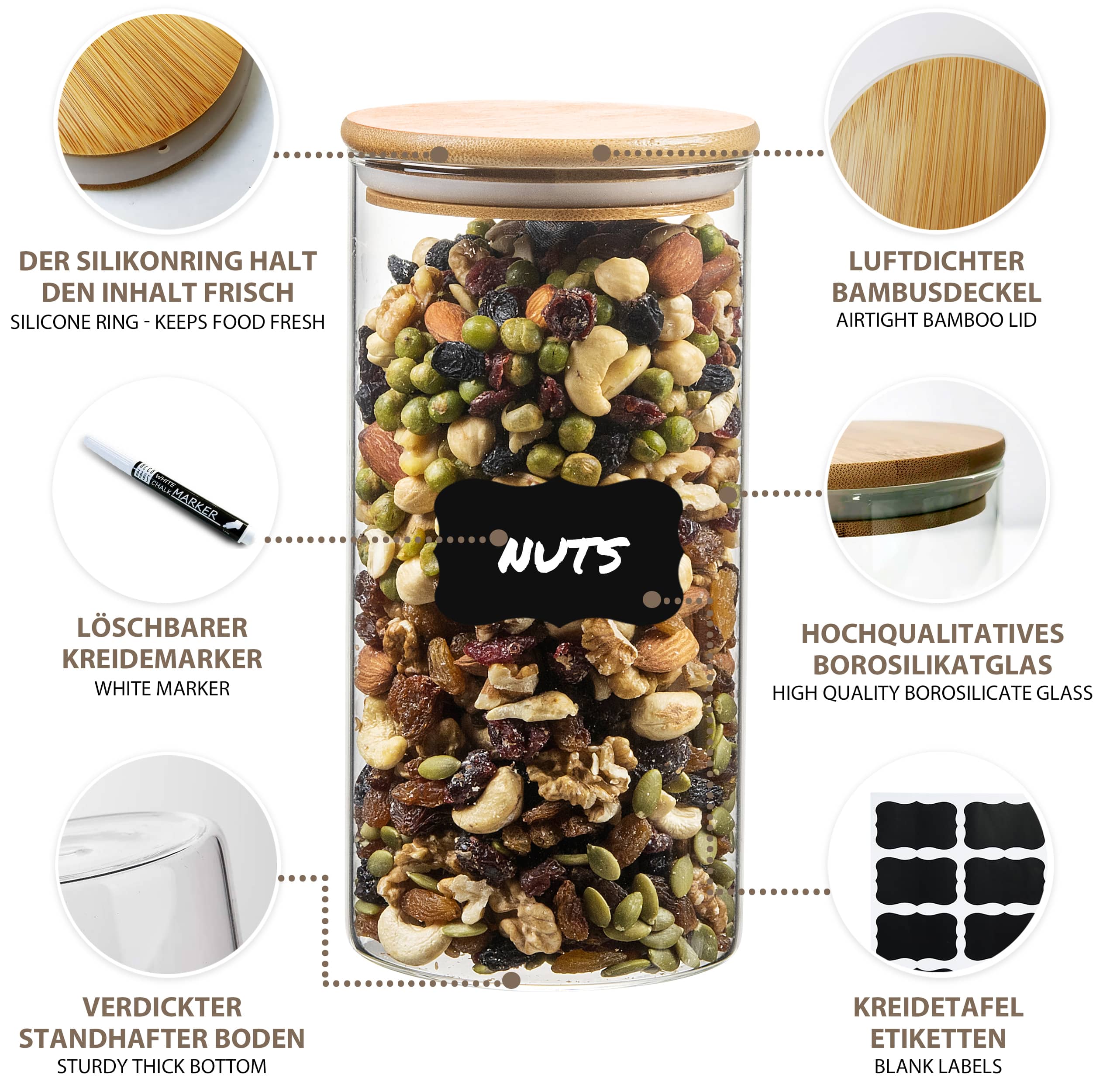 ✅ ETICHETAȚI-VĂ ALIMENTELE – Setul nostru de borcane cu capac din bambus conține, de asemenea, 8 etichete pentru a vă duce organizarea la nivelul următor. De asemenea, am adăugat un creion de cretă pentru a scrie numele obiectului depozitat în interior.