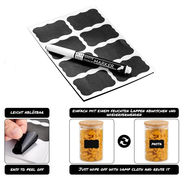 În plus față de borcanele de sticlă, veți primi și 8 etichete adezive practice pe care le puteți folosi pentru a vă eticheta recipientele de depozitare, ușile dulapurilor sau rafturile de condimente, folosind creionul de cretă care este, de asemenea, inclus. Etichetele pot fi șterse și rescrise în orice moment.